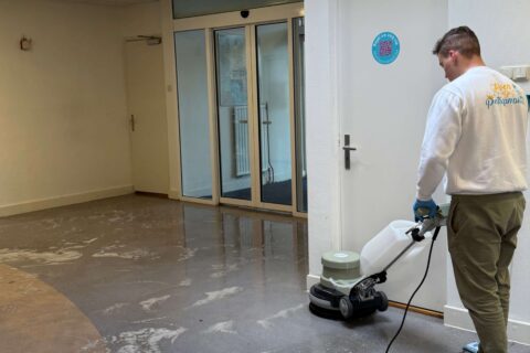 De vloer wordt gereinigd door middel van een schrobmachine en duurzaam reinigingsmiddel. Vuil en vocht wordt opgezogen en de vloer wordt geneutraliseerd.
